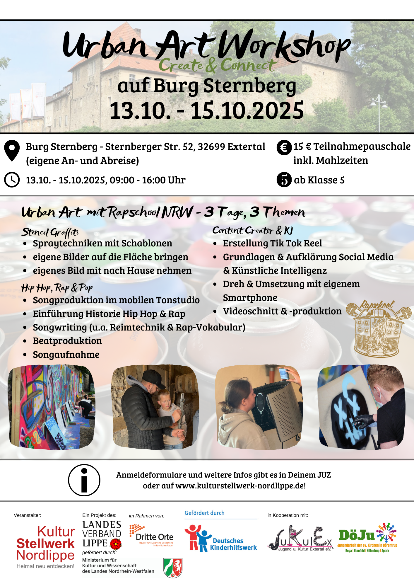 Anmeldung über das Anmeldeformular bei m.johannsmeier@kulturstellwerk-nordlippe.de. Der Workshop ist ein dreitägiges Angebot. Die Reihenfolge der Themen entscheidet sich wetterbedingt. Nur der Besuch einer einzelnen Aktion ist nicht möglich. Die Teilnahmepauschale ist einmalig für das gesamte 3-tägige Angebot. Das Angebot ist ab Klasse 5 bis einschließlich 18 Jahren. Eine Veranstaltung des Kulturstellwerks Nordlippe (ein Projekt des Landesverband Lippe) in Kooperation mit JuKulEx e.V. & der Dörentruper Jugendarbeit.