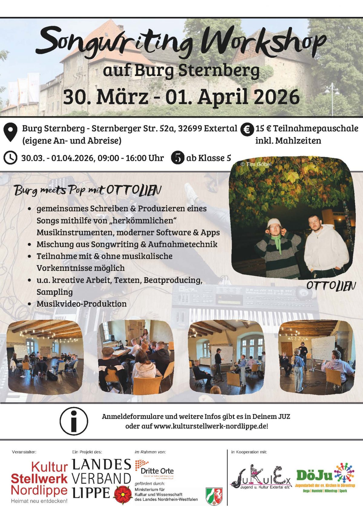 Der Workshop wird vom 30.0326 – 01.04.26 vom Kulturstellwerk Nordlippe zusammen mit dem JuKulEx e.V. und der Dörentruper Jugendarbeit auf der Burg Sternberg an (Sternberger Str. 52, 32699 Extertal) angeboten. Er richtet sich an Jugendliche ab Klasse 5. Der Workshop wird vom Musikduo OTTOLIEN geleitet und findet jeweils zwischen 9:00 bis 16:00 Uhr statt. Die Jugendlichen können mit und ohne musikalische Vorkenntnisse teilnehmen und gerne eigene Instrumente mitbringen!